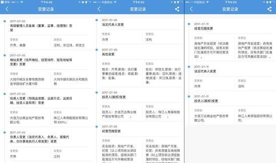工商信息显示,大同万达房地产开发有限公司、南昌西湖万达广场投资有限公司和崇州万达广场置业有限公司依次于2017年7月3日、7月5日和7月11日发生了信息变更,单一股东由“大连万达商业地产股份有限公司”变更为“珠江人寿保险股份有限公司”,法人均由“齐界”变更为“汪利”,董监高人员也全面“换血”。