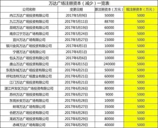 2017年5月9日至6月29日,全国19家万达商业项目公司——各地的万达广场投资公司集中进行了减资,注册资本金由原先最高24亿元,最低9000万元,统一减至5000万元。