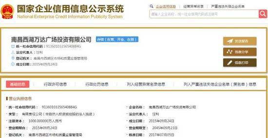 工商信息显示,南昌西湖万达广场、盐城万达广场两家公司法定代表人均在今年发生变更。