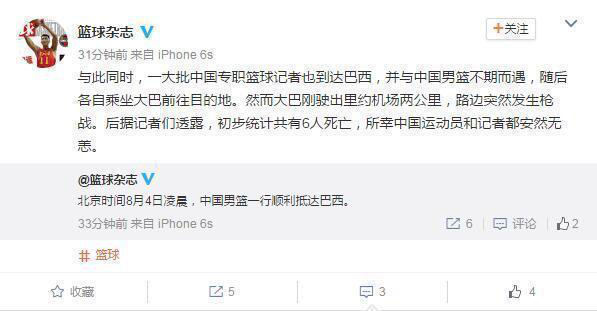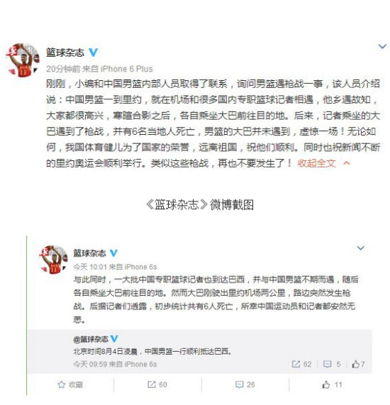 “一大批中国专职篮球记者也到达巴西,并与中国男篮不期而遇,随后各自乘坐大巴前往目的地。然而大巴刚驶出里约机场两公里,路边突然发生枪战。后据记者们透露,初步统计共有6人死亡,所幸中国运动员和记者都安然无恙。”《篮球杂志》微博描述了当时的惊险场面。