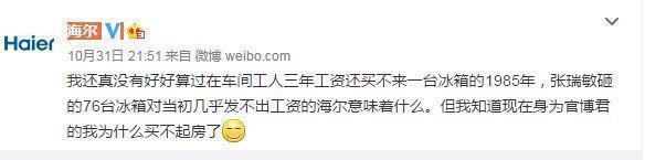 王健林一段讲话中称“海尔砸冰箱才值几个钱,我们赔10亿多”,引得海尔官微回应:我还真没有好好算过在车间工人三年工资还买不来一台冰箱的1985年,张瑞敏砸的76台冰箱对当初几乎发不出工资的海尔意味着什么。但我知道现在身为官博君的我为什么买不起房了!