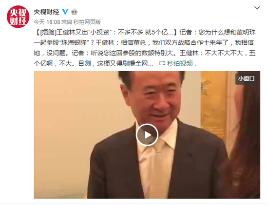 万达集团董事长王健林接受了央视财经记者的采访,谈及投资银隆的原因,王健林表示,一是因为万达与格力是紧密型的合作伙伴,二是基于对董明珠的信任。并赞叹格力称,在家电领域能够做到税收利率超过10%的,中国不敢说仅此一家,但也不会超过两家。以下是现场实录。