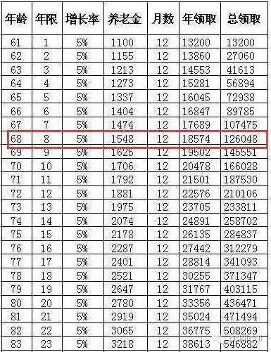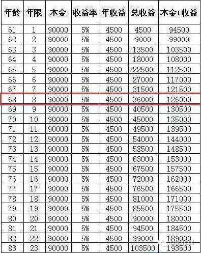 如果一次性把这9万交给政府,每月领养老金,每年的养老金预计有5%的涨幅(根据历史规律)。也就是说,大约第8年的时候,投资收益+本金与领取到的养老金大约持平,也就是说个人到68岁左右的时候,可以把养老金赚回来。