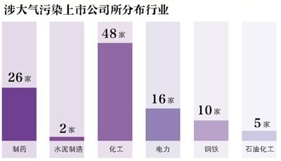 据同花顺向记者提供的不完全统计数据,北京本地及环京5个省市(河北、天津、山西、山东、辽宁),涉及包括制药在内的几大“污染行业”上市公司,总数不下于100家。其中钢铁企业10家,电力企业16家,化工企业48家,水泥2家,制药企业26家。其中河北涉污染的化工企业上市公司达7家,化工属涉污染公司最多的行业。