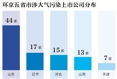 其中总部位于山东的涉“污染行业”上市公司数量为44家,辽宁省为17家,河北省15家,山西13家,北京12家,天津7家。这些上市公司中,包括许多大中型老牌国企。其中,有上市公司早前已有过环保“污点”。去年11月,在辽宁省环保部门对当地重污染天气的督察工作中,上市公司国电电力因旗下电厂烟尘超标排放而遭到点名;位于河北唐山的冀东水泥此前也被通报其下属企业存在较多废气超标排放的违规记录。