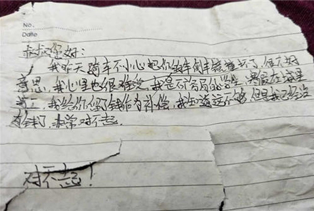 陈奕帆在道歉信中写道:“叔叔您好:我昨天骑车不小心把你的车倒车镜撞坏了,很不好意思,我心里也很难受,我是矿务局的学生,寒假在城里打工,我给你留了钱作为补偿,我知道这不够,但我已经没有钱了,非常对不起。”在信的后面,又写了一个大大的“对不起”。车主薛战民说,当时看到纸条后,觉得没必要再去追究责任,就顺手把纸条撕烂揉成团扔到地上。后来觉得该为这名学生做点什么,又把纸条捡了起来。