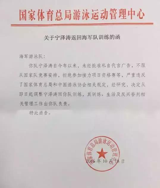 2月22日下午,一张《关于宁泽涛返回海军队训练的函》被曝出,立即以迅雷不及掩耳之势在网络上掀起了热议。此次被披露的宁泽涛遭“下放”的原因为:未经批准私自代言广告,不服从国家队竞赛安排,拒绝参加接力项目资格赛等,严重违反了国家体育总局和中国游泳协会相关规定。