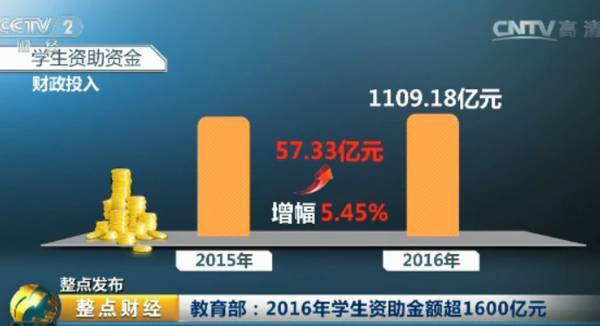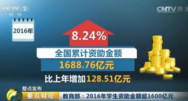 2016年,全国累计资助学生超过9000万人次,比上年增加692.87万人次,增幅7.6%。全国累计资助金额1688.76亿元,比上年增加128.51亿元,增幅8.24%。在学生资助资金中,财政投入共计1109.18亿元,比上年增加57.33亿元,增幅5.45%。