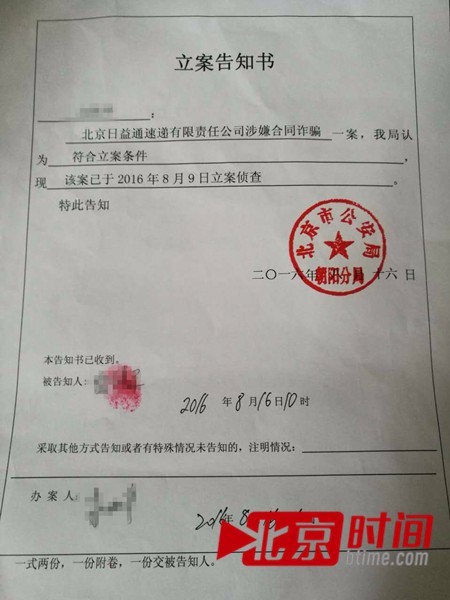 周明出具的一份《立案告知书》显示,2016年8月9日,北京朝阳警方已因“涉嫌合同诈骗”对北京日益通速递有限责任公司进行立案侦查。