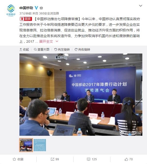 对此,中国移动已经给出回应,4月26日通过官方微博公布了"七项降费举措",并且全部将在今年5月份内陆续实施。