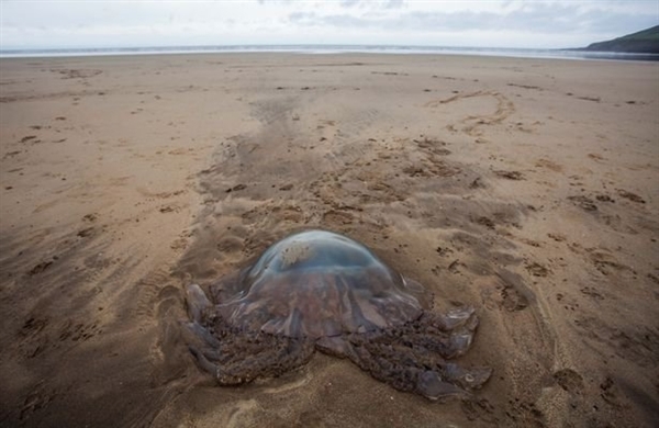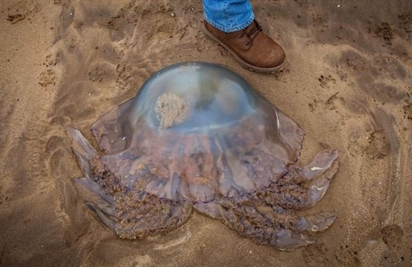 据《每日邮报》报道称,英国南部海岸惊现一只近1米宽的巨型水母,可能是被海水冲上岸的,其触手完全摊开来整体形状就像伞面一样。