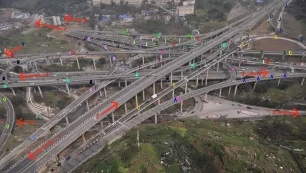 桥上密密麻麻的匝道分为了5层,20条匝道向8个方向延伸而去。重庆三横线、内环高速及机场专用高速三条道路在此相交,同时周边原有低速道路与三条高速在此相接,道路密集,高低不同,加上拐弯、转向等设计,让人很难分清每条匝道到底通向哪个方向。