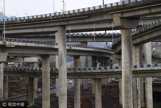 2017年5月31日,重庆主城区不少车辆穿梭在已经完工的黄桷湾立交桥上。图/视觉中国