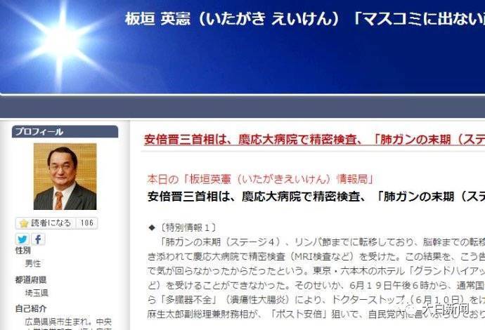 据悉,此消息来自日本自由记者板垣英宪,其发表的一篇博文中称,日本首相安倍晋三肺癌晚期(4期),已经转移到淋巴关节,转移到脑部只是时间的问题,所剩生命只有3个月。此消息一经传出便迅速发酵,但目前为止尚未得到权威媒体和官方的证实。