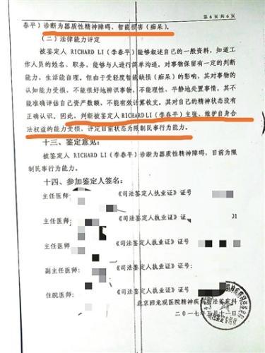 " 法律能力评定"上,鉴定机构认为:"判断被鉴定人RICHARD LI(李春平)主张、维护自身合法权益的能力受损,评定目前状态为限制民事行为能力"。具体来说,李春平能够叙述自己的一般资料,知道工作人员的姓名、职务,能够与人进行简单沟通,对事物保留有一定的判断能力,生活能自理。但由于受轻度智能缺损(痴呆)的影响,其对事物认知能力受损,不能很好地辨识事物,不能理性、平静地处置事情,其不能准确评估自己资产数额,不能有效计算收支,其对自己的精神状态没有正确认识。