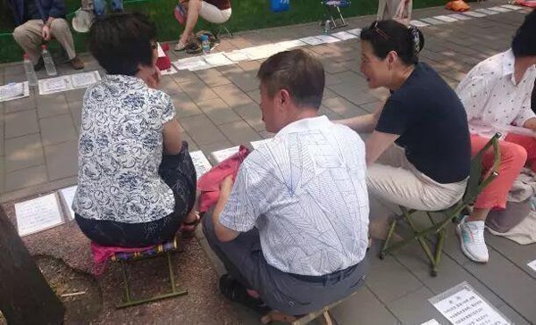 尽管天气炎热,仍有大量老年人自带板凳和相亲材料,到中山公园相亲角替儿女相亲。