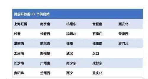 目前试点的供餐站共27个,主要是上海、天津、广州、南京、杭州、西安、沈阳、长春、武汉、济南、福州、厦门、长沙、成都、重庆、兰州等省会及计划单列市所在地高铁客运站。