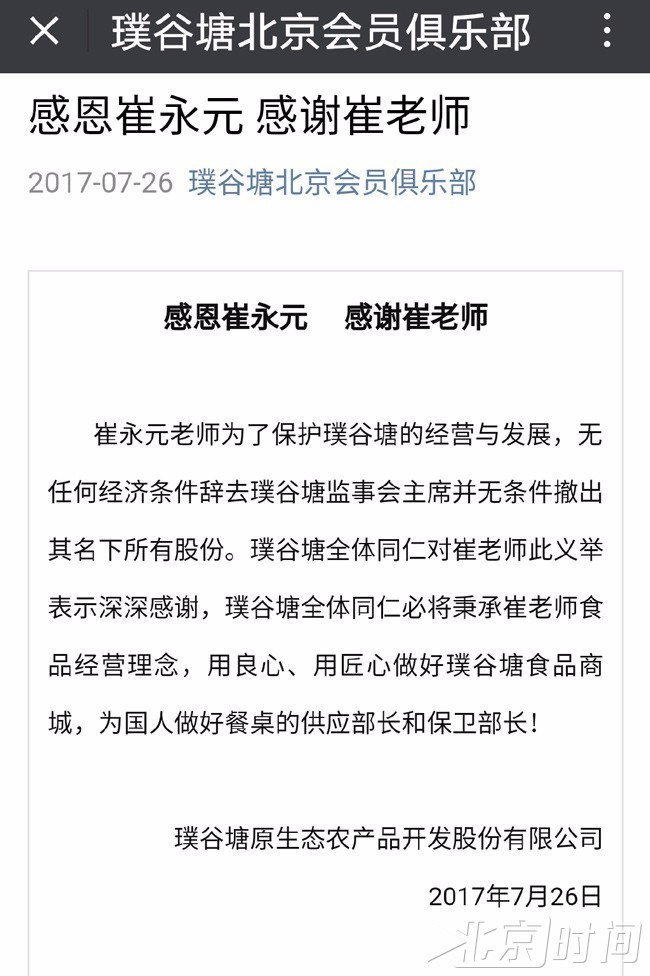 26日,崔永元通过其创立的非转基因食品商城“璞谷塘”旗下“璞谷塘安全食品俱乐部”微信发表公开声明,称将辞去璞谷塘担任的所有职务并退出所有股份,崔永元声称这与其反对转基因食品、导致个人受牵连有关。