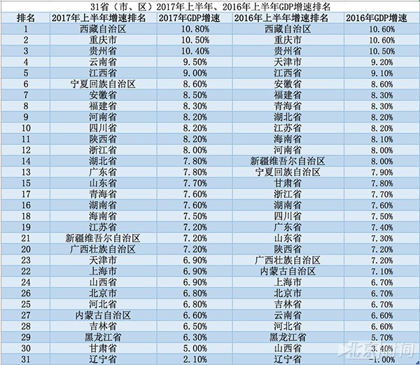 近日,31省(区、市)上半年的经济数据已全部出炉。根据各地统计部门数据发现,2017年上半年,西藏、重庆、贵州GDP增速实现两位数增长,领跑全国。
