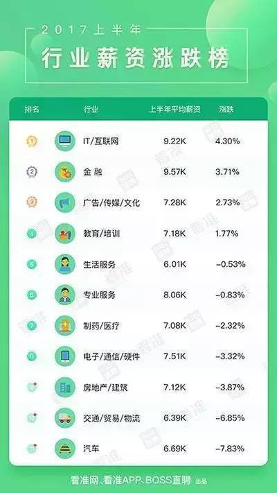 根据看准网和 BOSS 直聘综合的数据看,2017 上半年大多数行业的薪资涨幅不大,甚至有些行业的工资涨幅呈现负增长。但是,IT/ 互联网行业和金融行业,与 2016 年相比,仍有不错的涨幅,广告 / 传媒 / 文化行业也成功跻身 TOP3 排名。而偏传统的行业在今年上半年的表现则不那么令人满意,整个行业的平均工资涨幅呈现负增长。