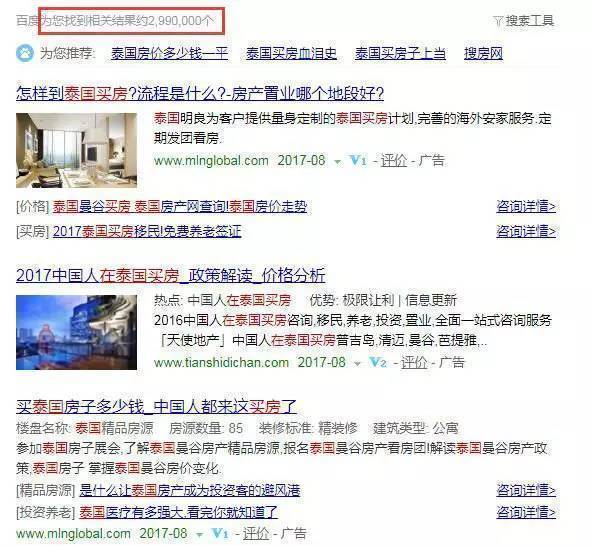 在搜索引擎中输入“泰国买房”后出现290多万条结果,其中包括各类宣传广告。