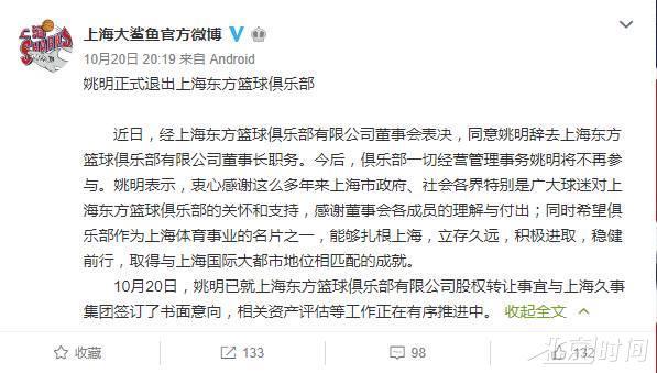 10月20日,上海男篮在微博上公布称,姚明正式辞去上海东方篮球俱乐部董事长职务,此后不再参与俱乐部经营管理工作。同时,姚明与上海久事集团签订股权转让意向书,向上海久事集团转让其所持有的上海大鲨鱼队股份。
